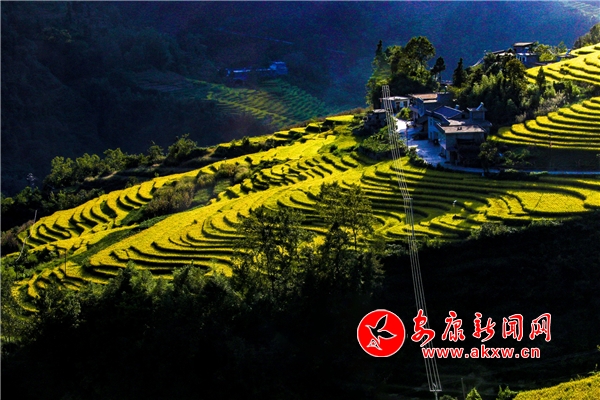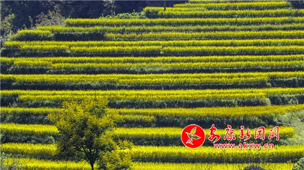 放眼望去,黃亮亮的稻谷,層層疊疊,從山底一直鋪到半山腰。水田都是依山而修,隨山形而變,高差均是隨坡放緩,形狀雖不十分規(guī)則卻也精巧,動人之處全在自然的水平線上。
