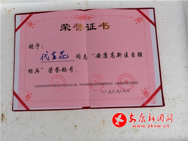 筆者從陳斌口中得知,2019年6月,代全花分別被安康高新區(qū)和五檔村黨支部、村委會授予“自強標兵”和“自主創(chuàng)業(yè)模范”榮譽稱號,去年一家成功實現(xiàn)了脫貧。?