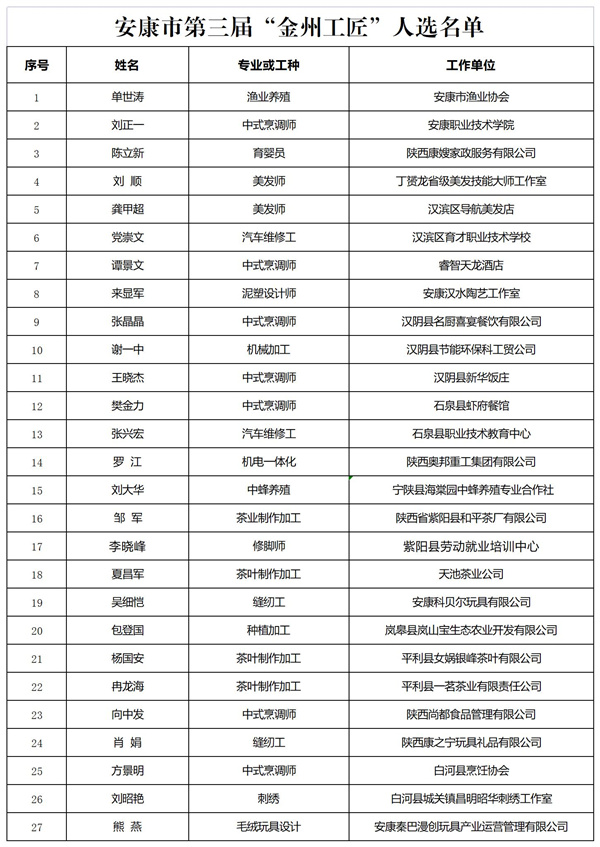 根據(jù)市委組織部、市總工會(huì)、市人社局《關(guān)于開展第三屆“金州工匠”評(píng)選活動(dòng)的通知》(安人社函〔2022〕243號(hào))和《安康市“金州工匠”評(píng)定辦法》,經(jīng)申報(bào)、評(píng)審并征求有關(guān)部門意見,擬評(píng)選安康市漁業(yè)協(xié)會(huì)單世濤等27人為安康市第三屆“金州工匠”,現(xiàn)予公示,公示期自2023年3月28日至2023年4月3日。