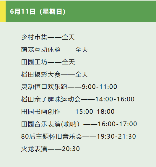 當日,現場還舉辦了稻田拔河、稻田摸魚、稻田摔跤等娛樂活動和田園古箏表演、70后主題懷舊音樂會、火龍表演等演出活動,吸引眾多游客朋友前來打卡。6月11日,靈動恒口歡樂跑、親子趣味運動會、嗩吶音樂表演、80后主題懷音樂會等活動精彩繼續(xù)......?