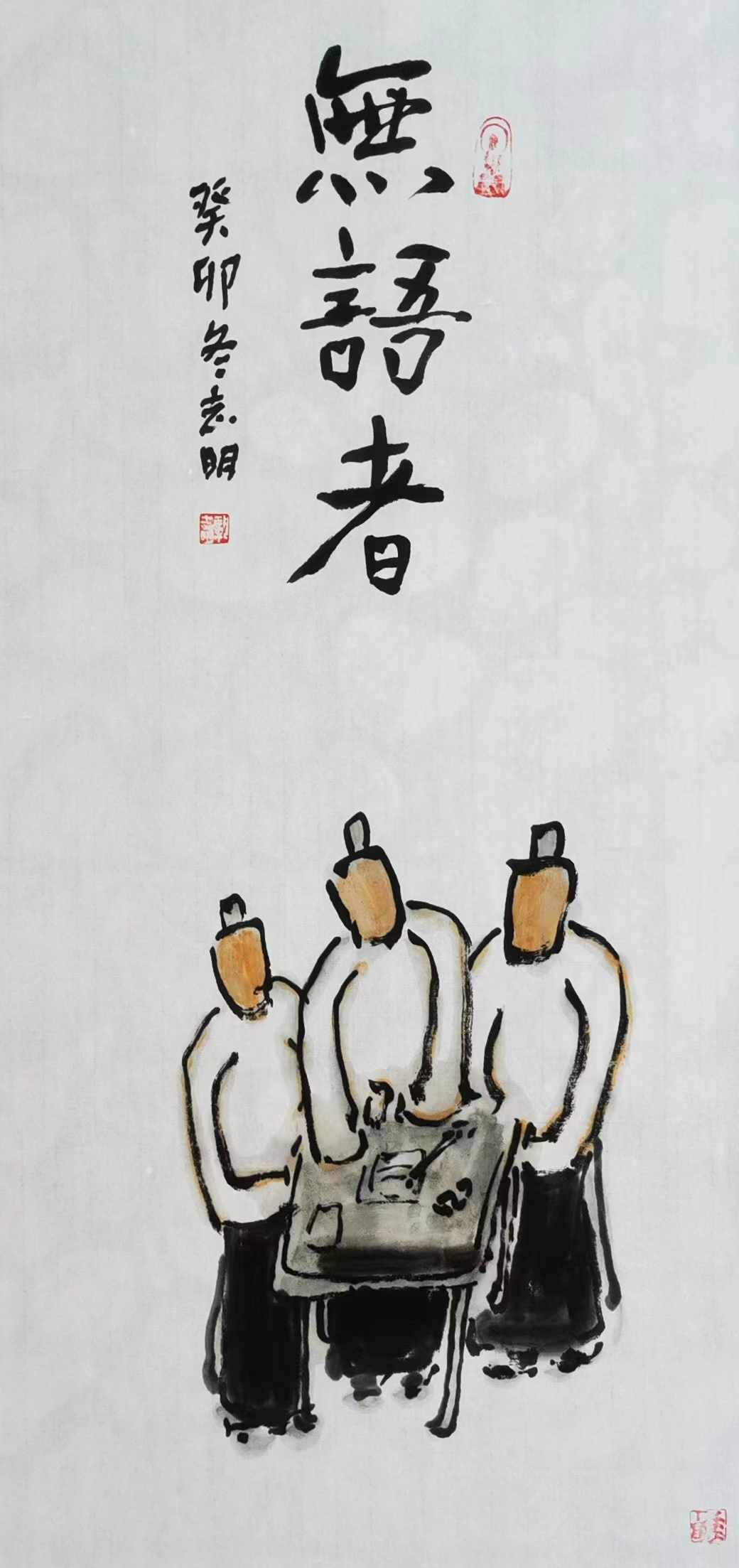 記得那一年的端午節(jié),鞏志明發(fā)來短信,是他寫的一首詩:綠粽黃酒聚江邊,白帆紅燭祭屈原。三千清淚流不得,九萬渾念飄上天。誰有郁悶誰散淡,何謂圓滑何忠奸。十丈風(fēng)塵古今在,談笑真?zhèn)位聼煛?017年,我遷新居,鞏老師為我寄來小品畫《福到眼前》,我很喜歡,并懸掛至新居玄關(guān)。這些年,鞏志明老師常做影展畫展策劃及影評(píng)講座,自已也臨池不輟,水墨丹青,寄情抒懷,他的文人小品有思想性、有創(chuàng)造性。雖畫的是松風(fēng)明月,小舟流水或遠(yuǎn)古人物,但都寄托了他當(dāng)下的心境,以消塊壘。誠如有人評(píng)論他為“吾師真文人,畫亦真性情!”他不僅只是身居畫室的怡情文人,他亦是心憂天下的豪俠。面對(duì)世間不平事,他也是激揚(yáng)文字,揮斥方遒!在功利的當(dāng)下,鞏志明尤其顯得難能可貴!?