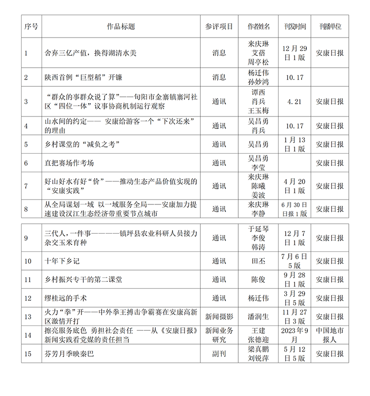經(jīng)過(guò)1月30日編委會(huì)推薦、社黨委研究決定,擬推薦以下15件新聞作品參評(píng)2023年度“陜西新聞獎(jiǎng)”。公示時(shí)間從2024年3月6日至2024年3月12日,公示期為5個(gè)工作日。如有不同意見(jiàn),請(qǐng)向安康日?qǐng)?bào)社機(jī)關(guān)紀(jì)委、新聞管理部反映。