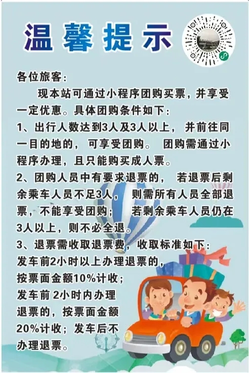 購(gòu)票政策:優(yōu)惠期間符合優(yōu)惠條件已經(jīng)網(wǎng)購(gòu)的車(chē)票可以全額退票。(乘車(chē)時(shí)辦理本人車(chē)票全額退款)