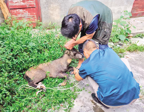 有著多次救助野生動物經(jīng)驗(yàn)的八仙保護(hù)站站長鄒奎兵,一邊安撫驚恐不安的野羊,一邊聯(lián)系當(dāng)?shù)孬F醫(yī)準(zhǔn)備救治。針劑急救,傷口處理,很快就緒,并臨時安置在千家坪林場廢棄的場院中。
