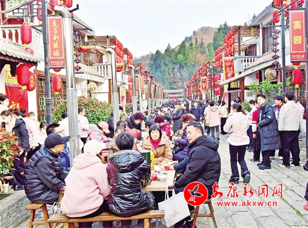 “開席啰……”隨著一聲鑼響,充滿儀式感的省級(jí)非遺庖湯盛宴正式開始。古色古香的店鋪門頭掛滿紅燈籠,石板鋪成的長(zhǎng)街上,賓客8人一桌圍爐而坐,道道美食依次上席,說(shuō)菜人“口吐蓮花”,菜越說(shuō)越香;酒歌高亢,越喝越暖;猜拳行令,秦巴漢子盡顯豪邁風(fēng)采;作坊小鎮(zhèn)高朋滿座,滿滿年味十里香飄。