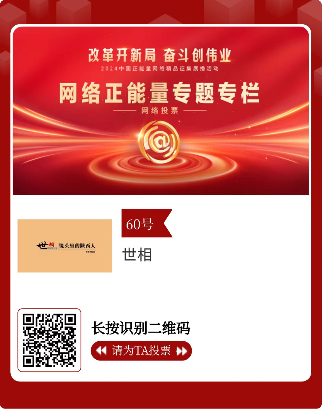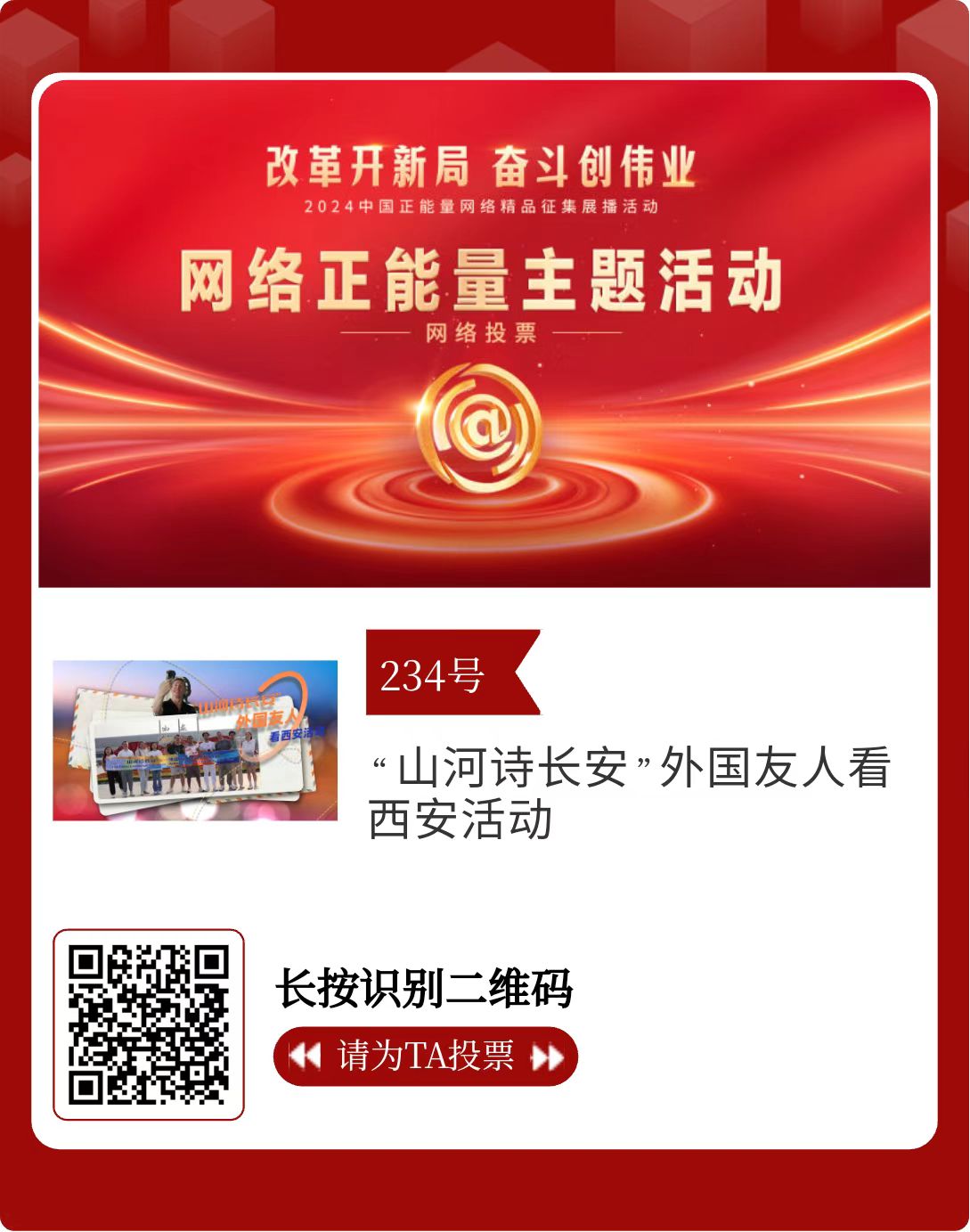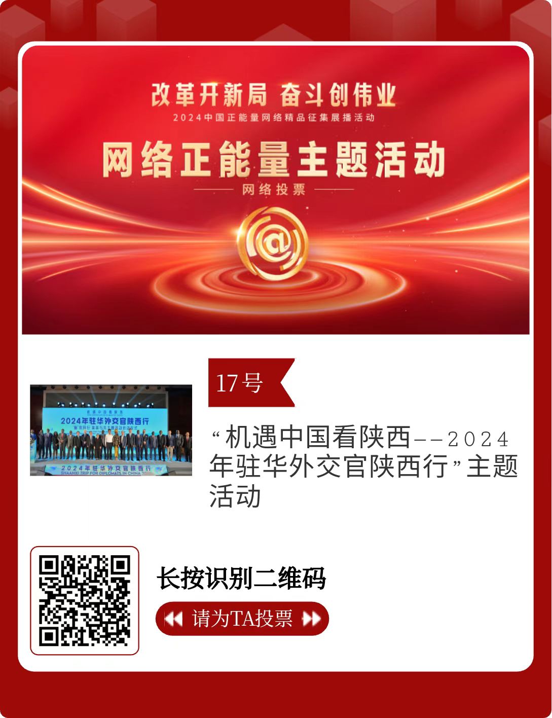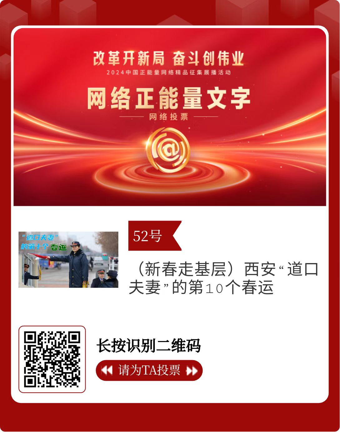 改革開新局,奮斗創(chuàng)偉業(yè)。由中央網(wǎng)信辦主辦的2024中國正能量網(wǎng)絡精品征集展播活動今天啟動網(wǎng)絡展播投票。