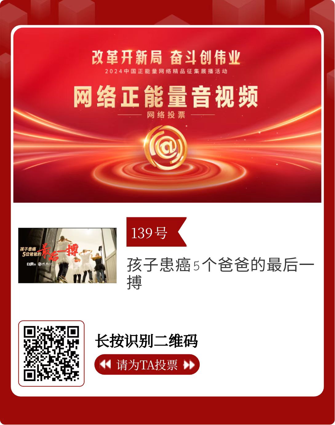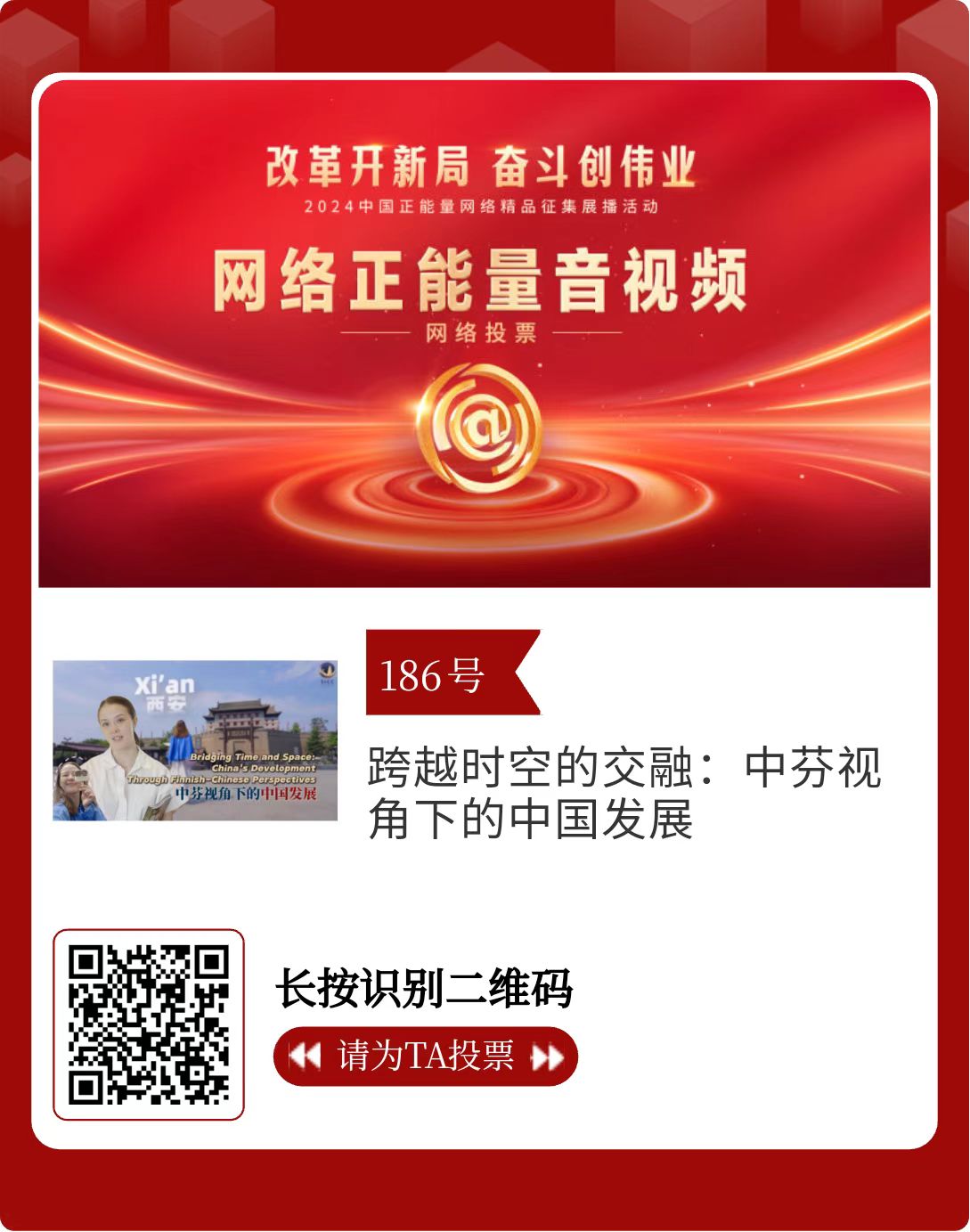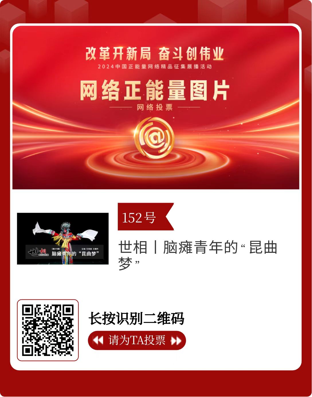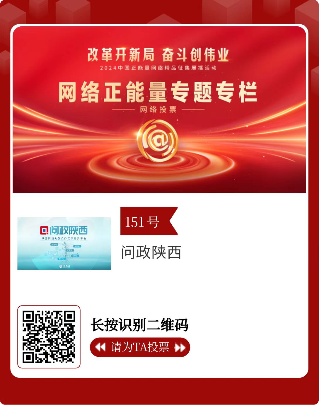 改革開新局,奮斗創(chuàng)偉業(yè)。由中央網(wǎng)信辦主辦的2024中國正能量網(wǎng)絡精品征集展播活動今天啟動網(wǎng)絡展播投票。