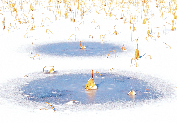 我的攝影創(chuàng)作圍繞生命的痕跡、時(shí)間的隱喻兩個(gè)主題。在《嘉實(shí)擷芳·野圃瑤音》中,菜園的微觀生態(tài)被賦予交響樂般的節(jié)奏——葫蘆藤的螺旋曲線是生命的律動(dòng),西紅柿根莖的垂直排列是生長(zhǎng)的秩序,蚜蟲蝕痕的細(xì)節(jié)則暗喻生態(tài)的共生與抗?fàn)?。而在《澄漪棹影·沙月溯光》里,榮成海岸的冬夏對(duì)比成為時(shí)間的隱喻,結(jié)冰湖面上的凋敗蓮蓬是流逝凝固的時(shí)光,夏日海邊的金色水洼則是流動(dòng)的永恒。我癡迷于捕捉這種矛盾與共生——就像用冷暖色調(diào)碰撞出畫面的張力,也用虛實(shí)構(gòu)圖處理每一張照片,期待每一張照片是個(gè)性鮮明,讓人耳目一新。