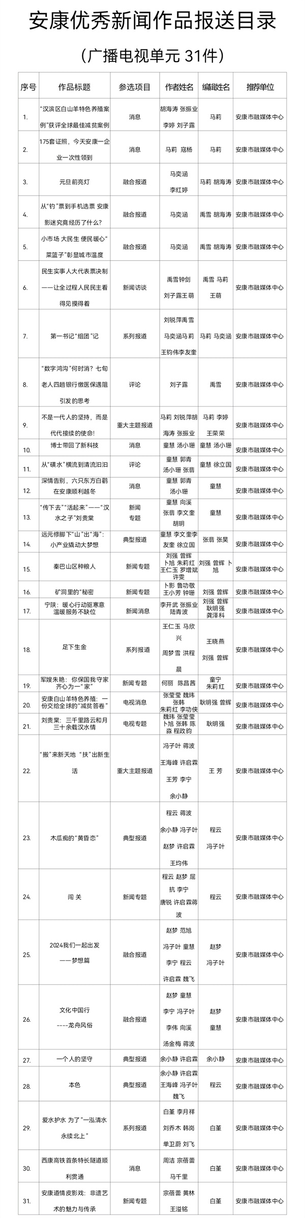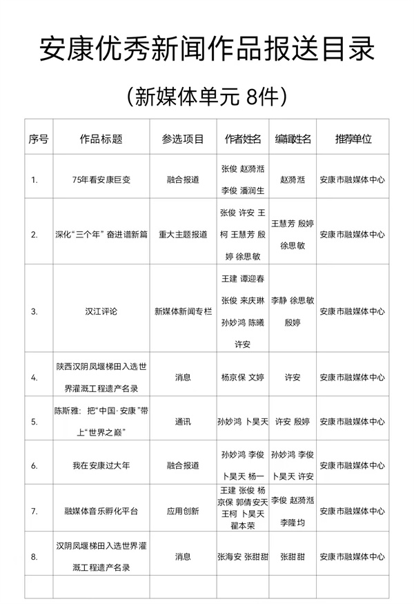 根據(jù)《關于開展2024年度安康優(yōu)秀新聞作品、安康市優(yōu)秀新聞工作者推選工作的通知》(安記協(xié)〔2025〕04號)文件要求,經推薦、領導審核,安康市融媒體中心推薦參評2024年度安康優(yōu)秀新聞作品97件(報紙單元58件,廣播電視單元31件,新媒體單元8件)?,F(xiàn)將報送作品目錄(詳見附件)予以公示。