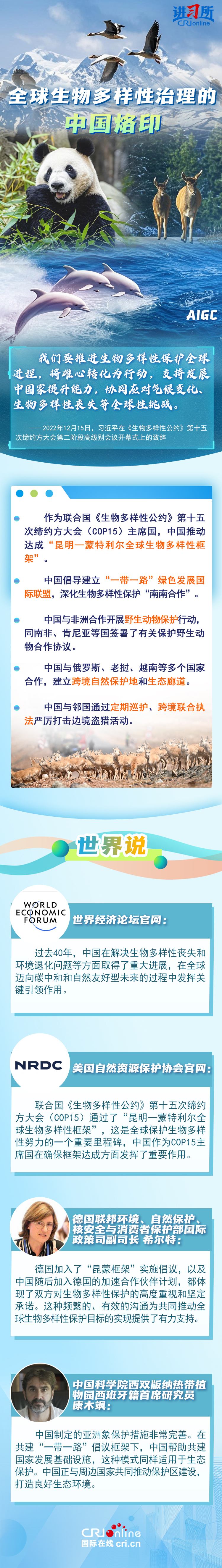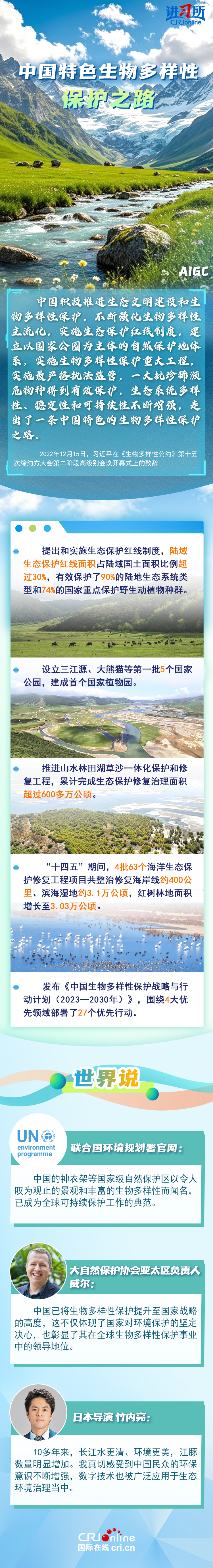 “心往一處想、勁往一處使,共建地球生命共同體。”作為最早簽署、批準(zhǔn)《生物多樣性公約》的締約方之一,生物多樣性保護(hù)已經(jīng)上升為中國的國家發(fā)展戰(zhàn)略。國際人士表示,中國的一系列舉措體現(xiàn)出對(duì)生態(tài)環(huán)境保護(hù)的堅(jiān)定決心,同時(shí),中國依托共建“一帶一路”倡議等國際合作機(jī)制,為推動(dòng)全球生物多樣性保護(hù)提供了有力支持,在邁向自然友好型未來的過程中發(fā)揮關(guān)鍵的引領(lǐng)作用。