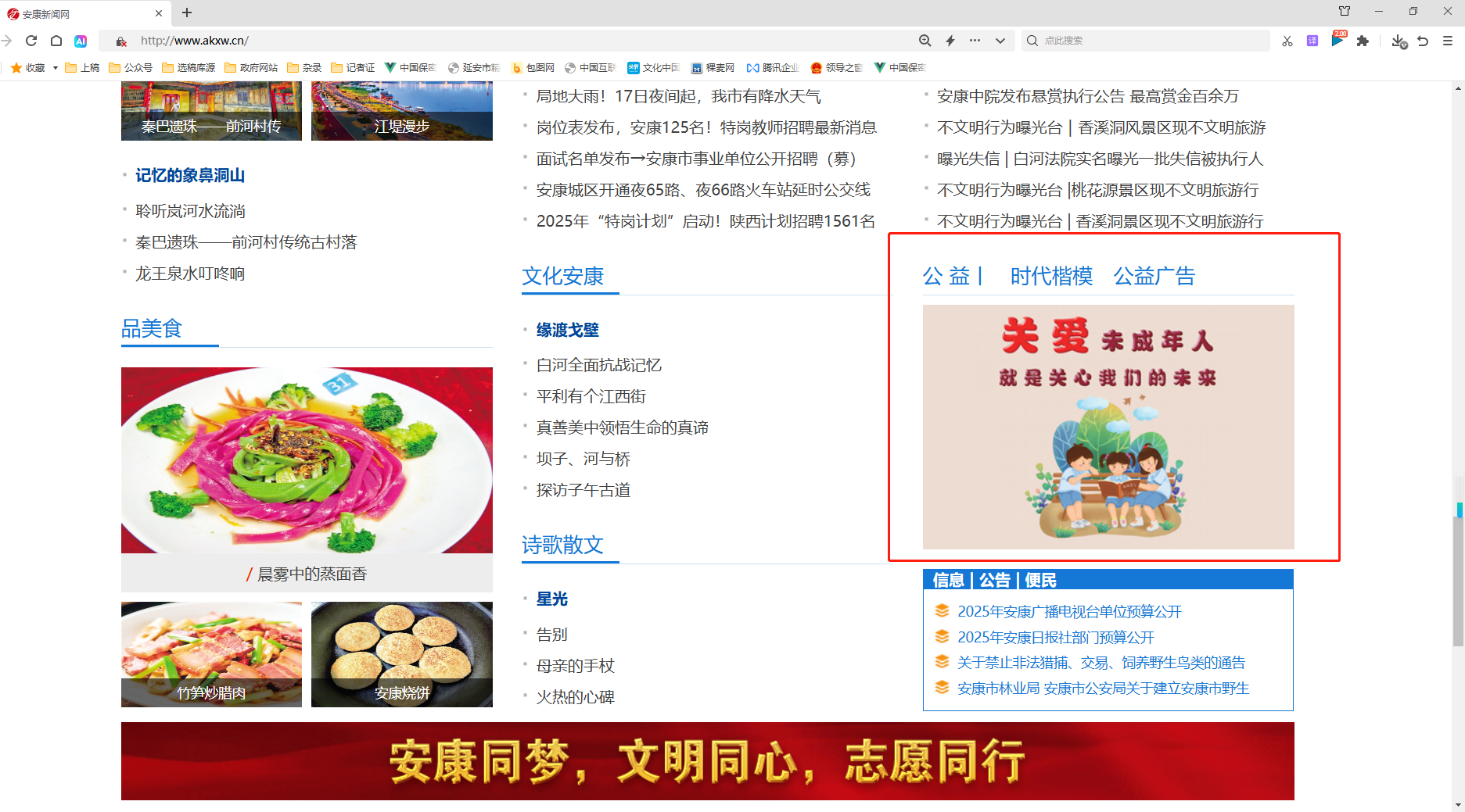網(wǎng)站首頁設(shè)置“公益”模塊,多頻次發(fā)布時(shí)代楷模、公益創(chuàng)文、道德模范等內(nèi)容的公益廣告131條。安康新聞網(wǎng)還積極開展支部“三聯(lián)”共建,助推鄉(xiāng)村振興,廣泛參與到文明創(chuàng)建、交通志愿服務(wù)、義務(wù)植樹、文化下基層等公益活動(dòng)。