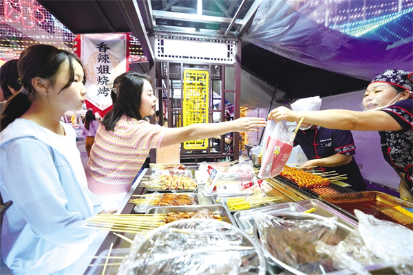 生態(tài)資源賦能場景體驗(yàn)。寧陜縣森林覆蓋率96.24%,居全國第一,負(fù)氧離子濃度超世衛(wèi)組織標(biāo)準(zhǔn)3倍,榮膺“中國天然氧吧”稱號(hào)?!按骞獯蟮馈被顒?dòng)深度嫁接生態(tài)優(yōu)勢,主打“21℃的夏天·清涼寧陜”體驗(yàn),將濱河公園舞臺(tái)與山林溪流自然聲景融合,夜間山風(fēng)伴隨演出的沉浸式場景獲游客好評。同步開設(shè)的“秦嶺山珍大集”“有好市小吃一條街”30余個(gè)展位展銷寧陜臘肉、羊肚菌、香菇;美食區(qū)現(xiàn)做洋芋糍粑、玉米鍋巴、麻辣豆腐干吸引游客頻頻駐足,形成“觀演+嘗鮮”閉環(huán)體驗(yàn)。