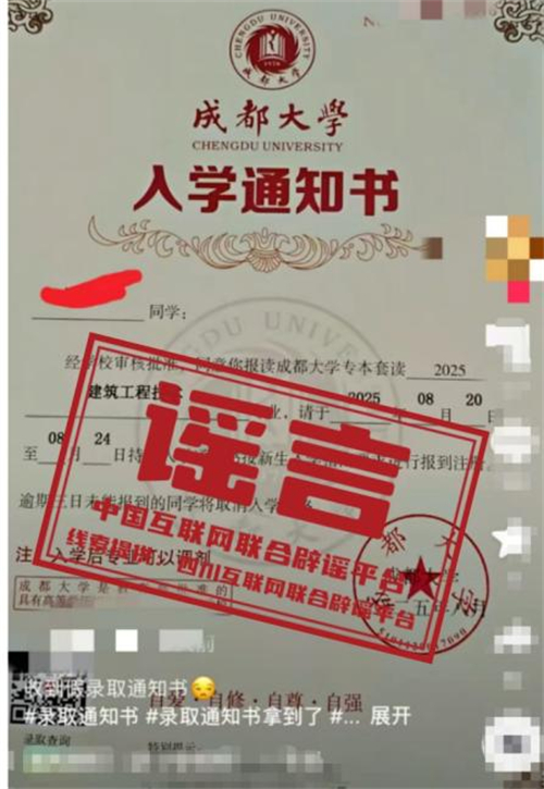 教育部多次提醒,部分機構和個人打著普通高等學歷教育幌子,實際卻為自考助學、網(wǎng)絡教育等其他教育形式,或進行虛假宣傳。如未通過高考招生錄取獲得正式通知書,無法注冊普通高校正式學籍,也無法取得普通高等學校學歷證書。考生及家長應通過正規(guī)渠道核驗錄取信息,嚴格保護個人信息,防止被不法分子利用。(來源:四川互聯(lián)網(wǎng)舉報辟謠平臺、成都網(wǎng)絡辟謠)