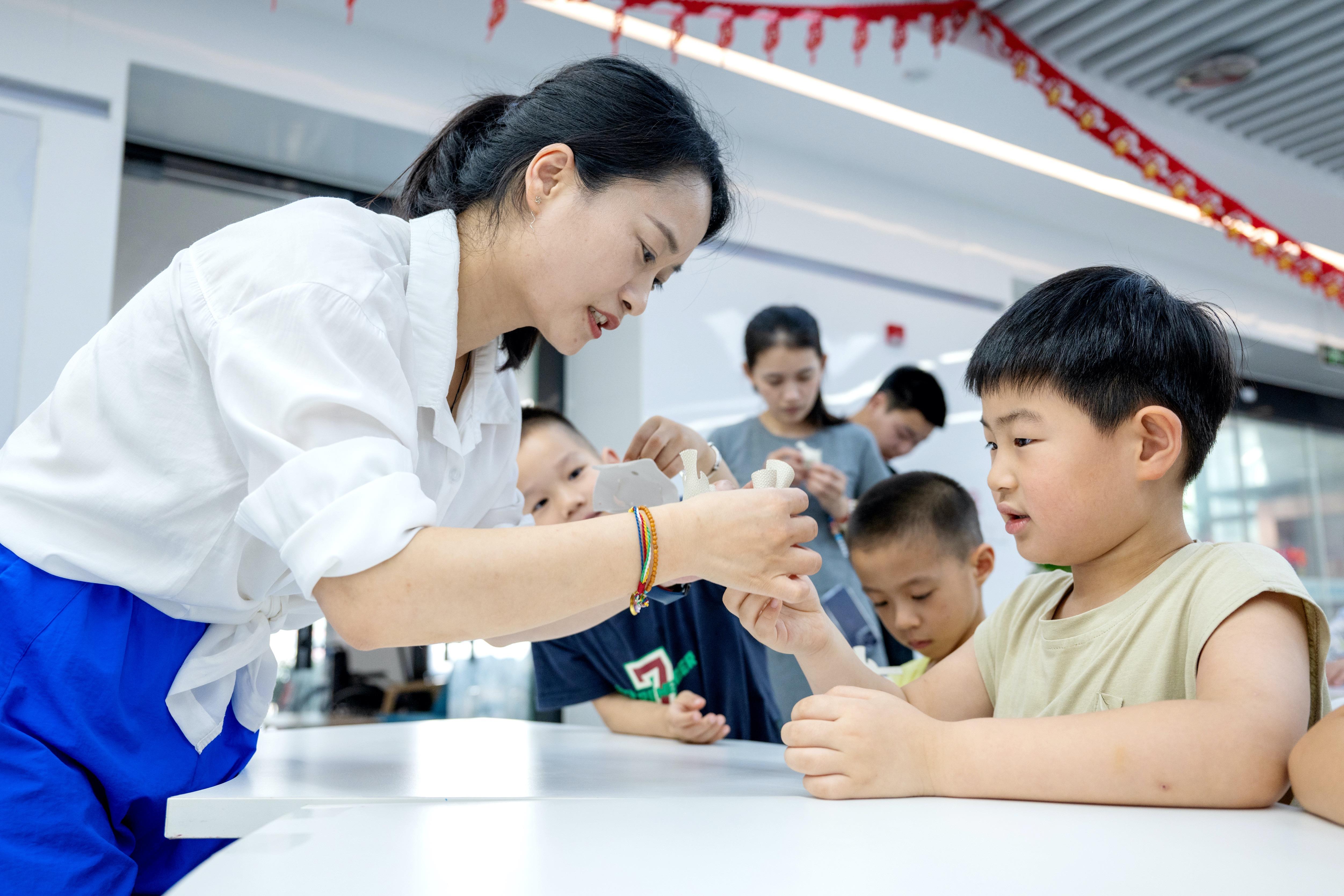 △2025年7月3日,浙江湖州長(zhǎng)興縣龍山街道齊北社區(qū)幸福鄰里中心,志愿者指導(dǎo)孩子們制作手工。
