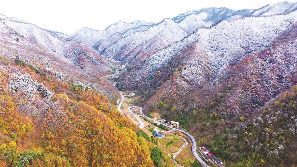 車子繼續(xù)向前,離寧陜越來越近時,車窗外那片銀裝素裹的童話世界竟悄悄退場,再次將五彩斑斕鋪展開來。楓紅未減,葉黃依舊,深綠的枝葉間還凝著點點雪色,像是剛從時光隧道走出一般。陽光不知何時鉆出了云層,照在未化的雪上,泛起細(xì)碎的晶瑩。這時的山野,既有秋的飽滿,又有冬的清澈,仿佛一場盛大的交接正在無聲進(jìn)行,秋不忍盡褪其色,冬亦不忍驟掩其華,于是二者相融,成就了這短暫而珍貴的相遇。