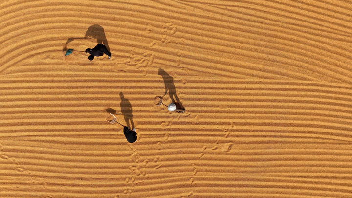 2025年10月28日,在山東省棗莊市市中區(qū)稅郭鎮(zhèn),農(nóng)民晾曬收獲的玉米(無人機照片)。新華社發(fā)(孫中喆 攝)