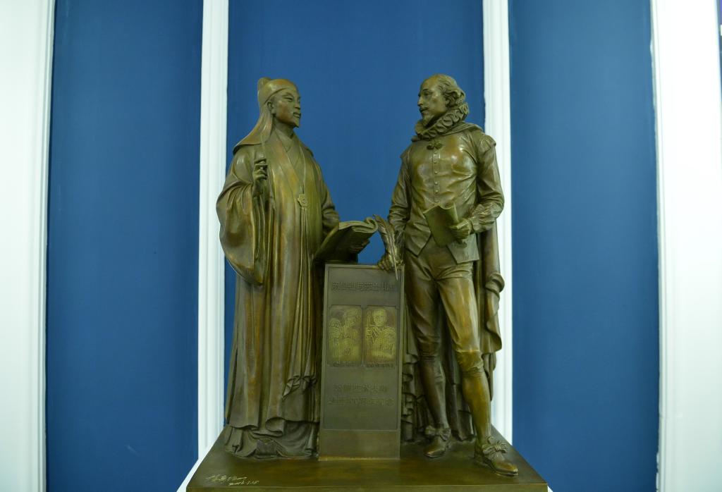 這是中國江西撫州湯顯祖紀念館陳列的湯顯祖遇見莎士比亞銅像(2016年10月12日攝)。新華社記者 周密 攝