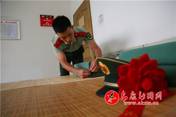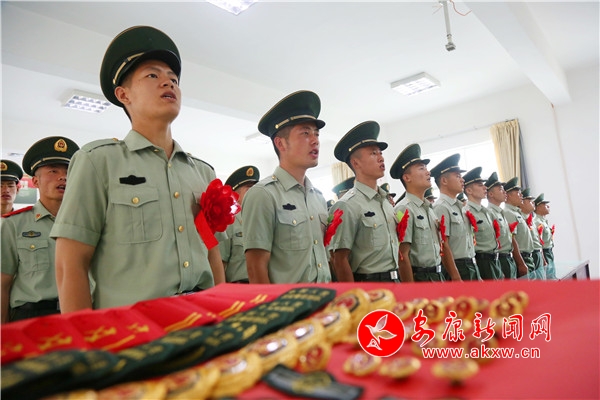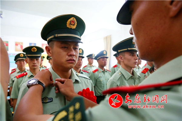 “為滿服役期士兵卸軍銜……”離隊(duì)前,留隊(duì)?wèi)?zhàn)友為退伍老兵卸下警銜、領(lǐng)花、帽徽和胸標(biāo),為他們戴上“光榮花”。此時(shí)此刻,訓(xùn)練場(chǎng)上的汗流浹背、執(zhí)勤路上的日曬雨淋、比武場(chǎng)上的斬金奪銀、戰(zhàn)友之間的情同手足,一幕幕,一幀幀,如此真切,如此清晰,一切的一切都成了最美好的回憶。“我舍不得這心愛(ài)的紅肩章、綠迷彩。”退伍老兵馮歡看著卸下的肩章潸然淚下。