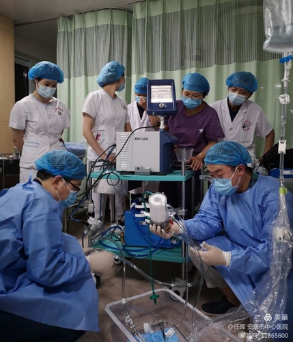 心內(nèi)科一病區(qū)全科醫(yī)護(hù)人員都在緊鑼密鼓地為ECMO治療前做充分的準(zhǔn)備,包括人員的調(diào)配、物資的準(zhǔn)備、ECMO儀器的調(diào)試。ICU李江主任親自參與了整個(gè)救治過(guò)程,介入中心、麻醉科、呼吸科都派出精兵強(qiáng)將協(xié)助手術(shù)開展。晚上11點(diǎn),在所有人員、物資到位后,馬上開始了ECMO的管路預(yù)沖,股動(dòng)、靜脈鞘管的置入。當(dāng)ECMO儀器啟動(dòng),離心泵運(yùn)轉(zhuǎn),暗紅色的血液從股靜脈引出,然后經(jīng)過(guò)膜肺氧合,轉(zhuǎn)變?yōu)轷r紅色的血液再?gòu)墓蓜?dòng)脈回到患者的體內(nèi),很快患者心率血壓得到穩(wěn)定、血氧飽和度顯著改善,患者癥狀也得到緩解。