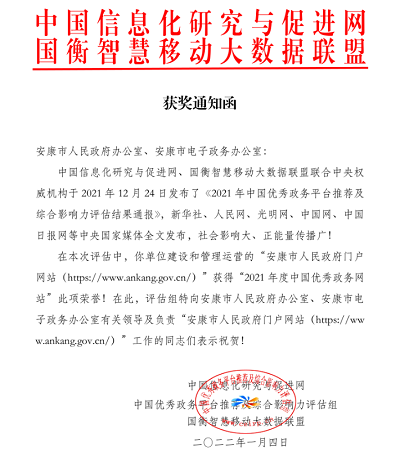 本網(wǎng)訊(通訊員 葉苗) 日前,中國信息化研究與促進網(wǎng)、國衡智慧移動大數(shù)據(jù)聯(lián)盟聯(lián)合中央權威機構發(fā)布《2021年中國優(yōu)秀政務平臺推薦及綜合影響力評估結(jié)果通報》,安康市人民政府網(wǎng)站獲評“2021年度中國優(yōu)秀政務網(wǎng)站”,新華社、人民網(wǎng)、光明網(wǎng)、中國網(wǎng)、中國日報網(wǎng)等中央國家媒體全文發(fā)布。
