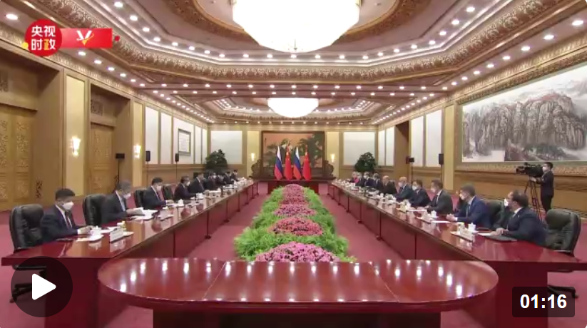 米舒斯京說(shuō):“尊敬的習(xí)近平主席,首先請(qǐng)?jiān)试S我向您轉(zhuǎn)達(dá)俄羅斯聯(lián)邦總統(tǒng)普京的親切問(wèn)候和良好祝愿。今年3月份,他同您在莫斯科舉行的會(huì)談至今仍使他倍感親切。我們非常珍視同中國(guó)的睦鄰友好合作伙伴關(guān)系。”