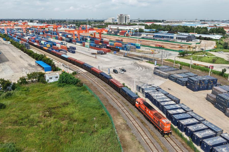 8月27日,一列貨運(yùn)列車駛?cè)胛挥谏虾鲜痉秴^(qū)內(nèi)的中國(guó)-上海合作組織地方經(jīng)貿(mào)合作示范區(qū)多式聯(lián)運(yùn)中心(無人機(jī)照片)。新華社記者李紫恒攝