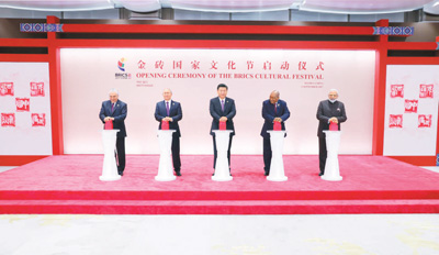 同日,金磚國家領(lǐng)導(dǎo)人共同出席金磚國家文化節(jié)啟動(dòng)儀式暨文化圖片展。習(xí)近平和其他金磚國家領(lǐng)導(dǎo)人在各國印章柱上按下印章,對(duì)面屏幕上同時(shí)顯示出金磚國家中文國名篆刻印文,共同啟動(dòng)文化節(jié)開幕式。隨后,五國領(lǐng)導(dǎo)人共同參觀金磚國家文化圖片展,并觀看金磚國家首部合拍影片《時(shí)間去哪兒了》片花。