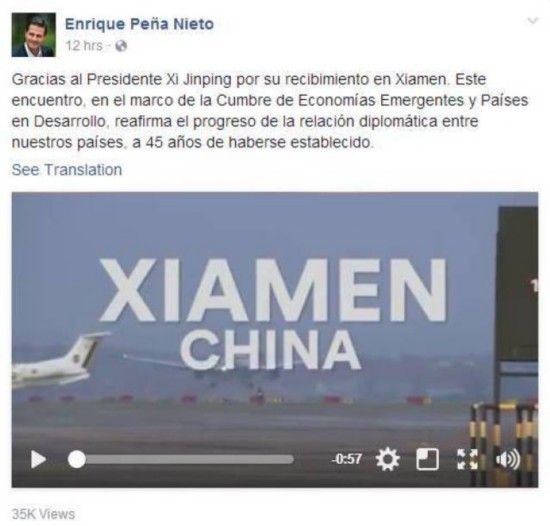 墨西哥總統(tǒng)培尼亞參加了5日召開的新興市場國家與發(fā)展中國家對話會,商討“金磚+”合作。他在臉譜賬號上發(fā)文說:“感謝習(xí)近平主席在廈門的款待。在新興市場國家與發(fā)展中國家對話會期間(與習(xí)主席)的會晤,在(墨中)建交45周年之際,加深了我們兩國之間的外交關(guān)系!
