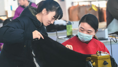 | 12月8日,河北省棗強(qiáng)縣某服裝企業(yè)工作人員正在工作中。目前,該縣年出口裘皮服裝服飾300余萬件。 |