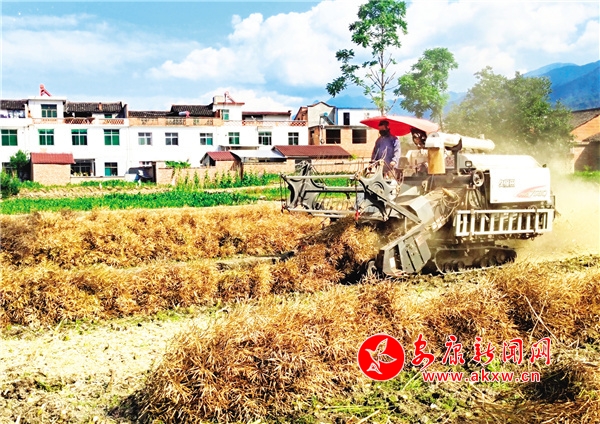 為支持農(nóng)戶實現(xiàn)夏糧豐收,力保油菜籽顆粒歸倉,該鎮(zhèn)協(xié)調(diào)30余臺收割機投入油菜收割。4臺收割機正穿梭于五一村三組的油菜地里,收割、脫粒、秸稈還田,整個收割過程一氣呵成。看著自家3畝的油菜地在半小時內(nèi)就完成收割,村民成芳難掩心中的喜悅。