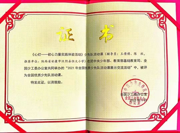 本網(wǎng)訊(通訊員 林愛銘)近日,共青團中央少年部、教育部基礎(chǔ)教育司、全國少工委辦公室公布“2021年全國優(yōu)質(zhì)少先隊活動課”名單。漢陰縣恒大小學(xué)選送的少先隊活動……