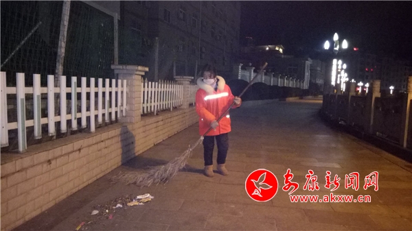 圖為環(huán)衛(wèi)工人吳志美大年初一、初五凌晨街上空無一人的時候,她默默的在清掃大街小巷(筆者晨練偶遇隨拍), 他用一身寒霜溫暖縣城清晨!C7c安康新聞網(wǎng)