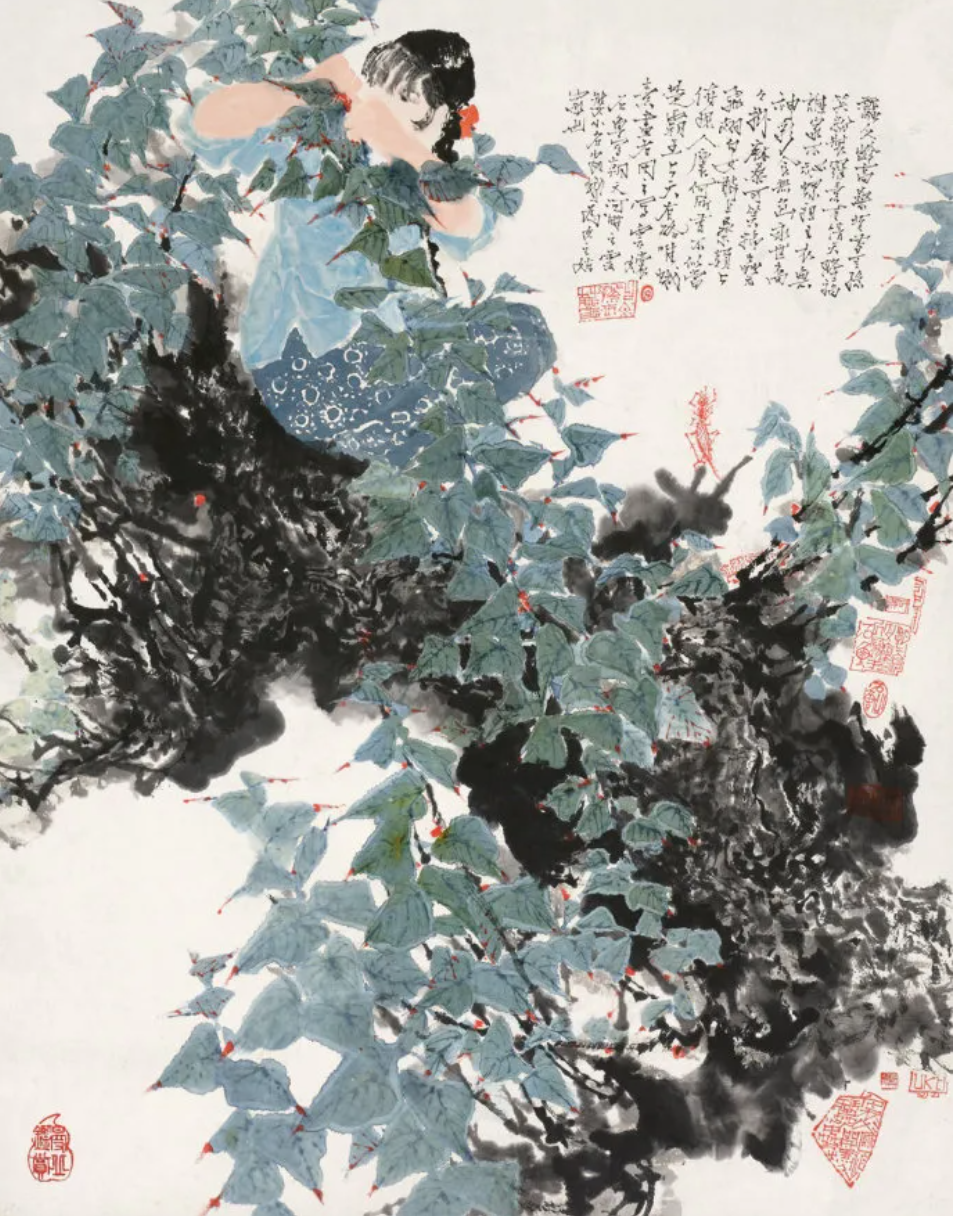 題識(shí):蠶女齡喬桑,昔有王孫笑粉妝。羅素有情天降福,誰(shuí)家不秘王祖。衣無(wú)神采食無(wú)魚(yú),永世商裔掛麻桑?尚γ尴x(chóng)無(wú)飛翅,白女敢上桑顛上。俯視人寰何所有,不似當(dāng)(年)楚霸王。上天有路唯蛾素,畫(huà)者因之寫(xiě)云。石魯寫(xiě)朝天河畔之云婆,小名安蛾,為女之姑家也!恫缮D》,2010春拍成交價(jià)1064萬(wàn)元。